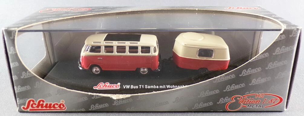 Schuco 21690 Ho 1:87 VW Red & Cream Van T1 with Caravan Mint in Box