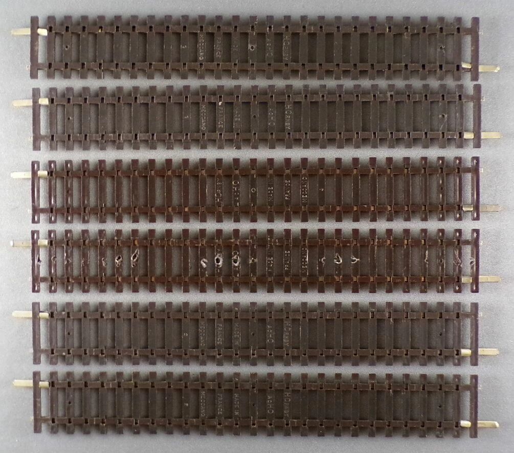 Hornby AcHo 7500 6 x Straight nickel silver track 219 mm. Very good condition, complete with fishplate on both end ,screw holes enlarged on the sleepers of one rail, without original box