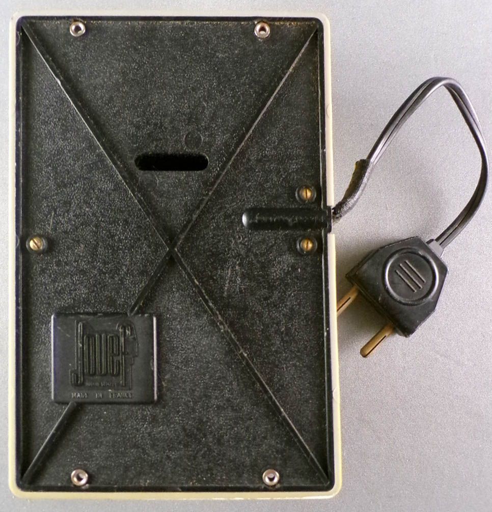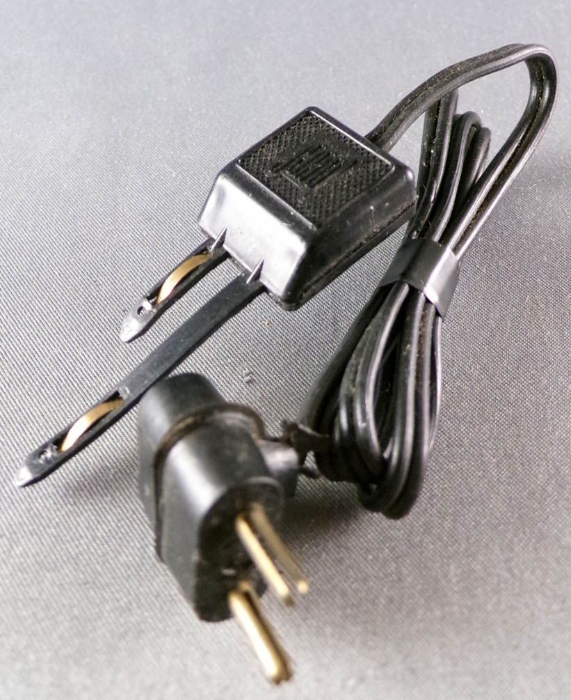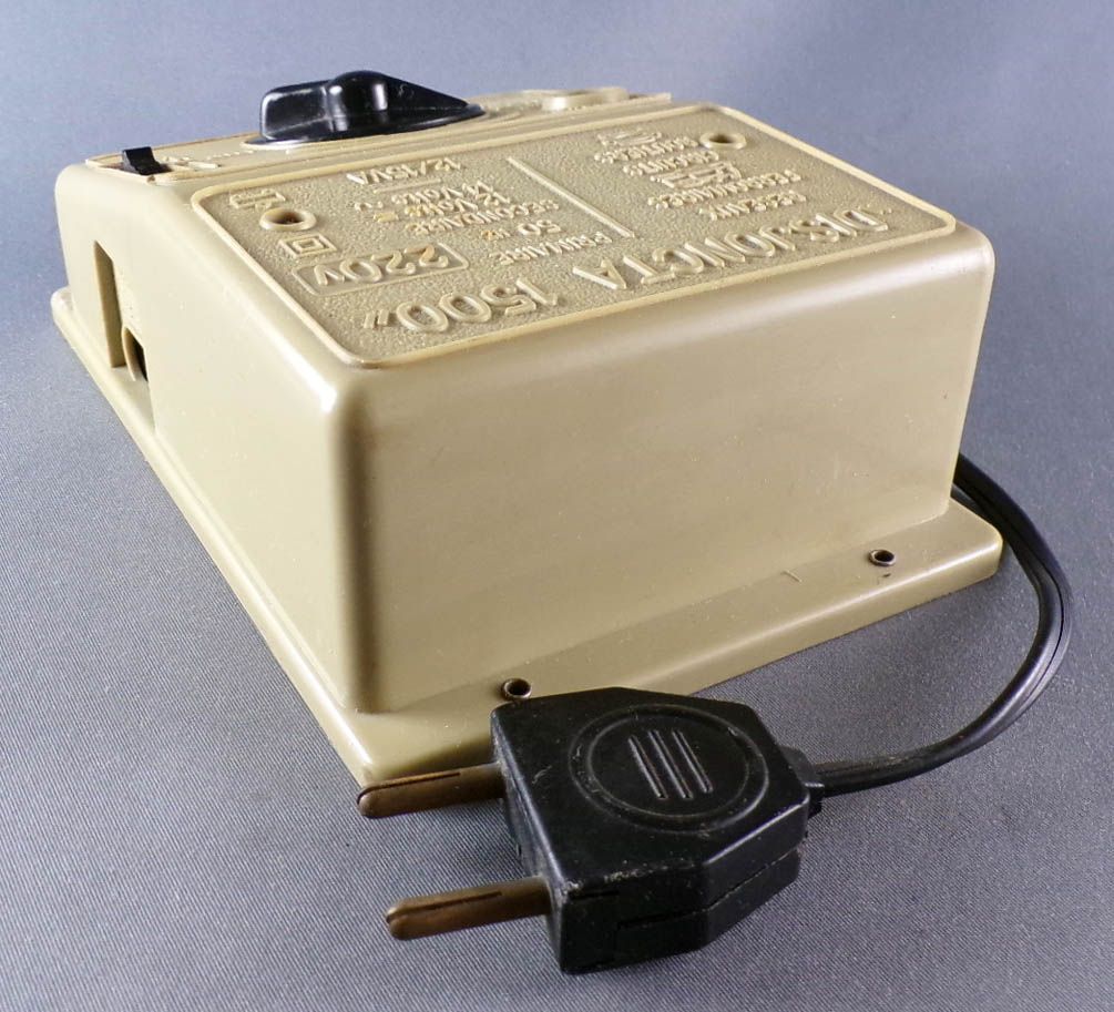 Jouef 1500 Ho Disjoncta rectifier transformer with circuit breaker 220V DC 12V 1A + AC 14V 1A with speed controller and direction reverser. Primary 220V 50Hz secondary 12V 1A DC and 14V 1A AC for accessories. In box, grey plastic body partially yellowed, tested, works, complete with shortened mains cord, power cable for rails and accessory plug.