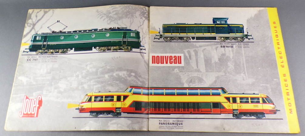 Jouef 1966 Catalogue Steam, Electric, Diesel Locos, Wagons, Coachs, buildings, tracks, slot cars. 32 Colors Pages. 20 x 21 cm. Used, good condition, marks on covers, clean pages with crosses and marks on certain models written in pencil (erasable), except for one written in pen.