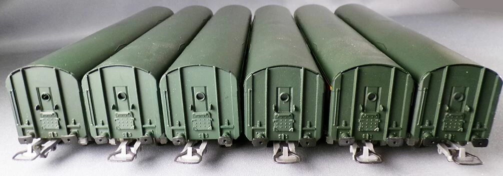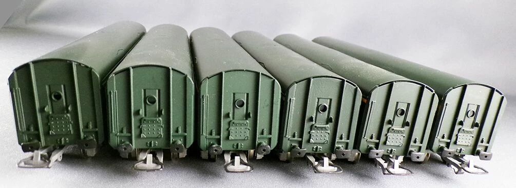 Green livery, green roof. No interior, metal wheels, universal couplers. Length 216 mm. Mi,t in original box, complete, buffers ok, unsed, complete, buffers ok, boxes are in good condition, the tricolour boxes are complete with all flaps, ther is writing on the red lid of ref 5104.