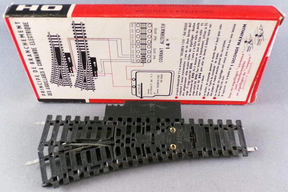 Jouef 84E Ho 1 x Right-hand electric cut-off switch steel/brass rails R385, length 153 mm. Very good condition with original box, complete with fishplate on both ends.