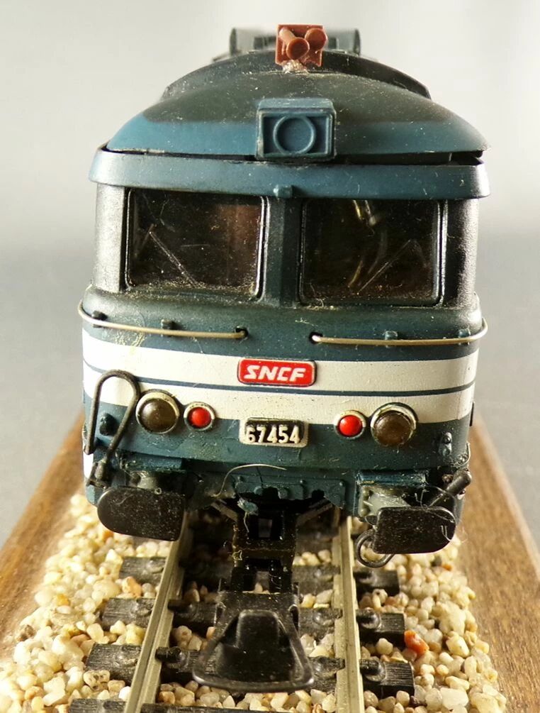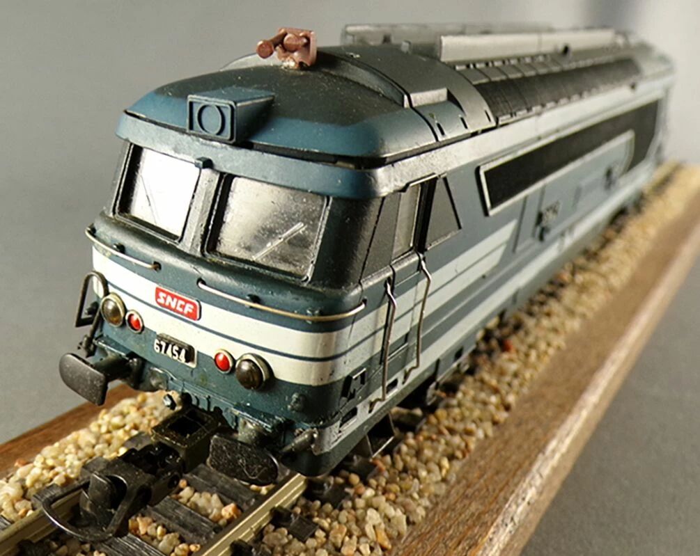 Jouef 8593 HO SNCF Diesel Locomotive BB 67454, blue & white livery with lighting on one side.
