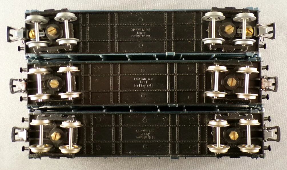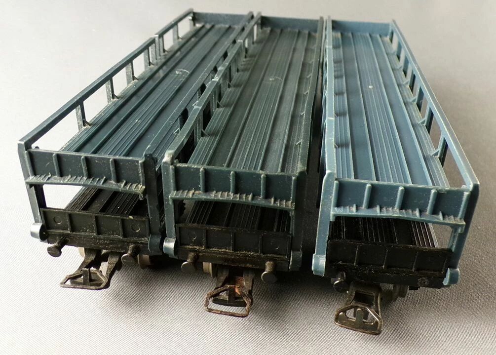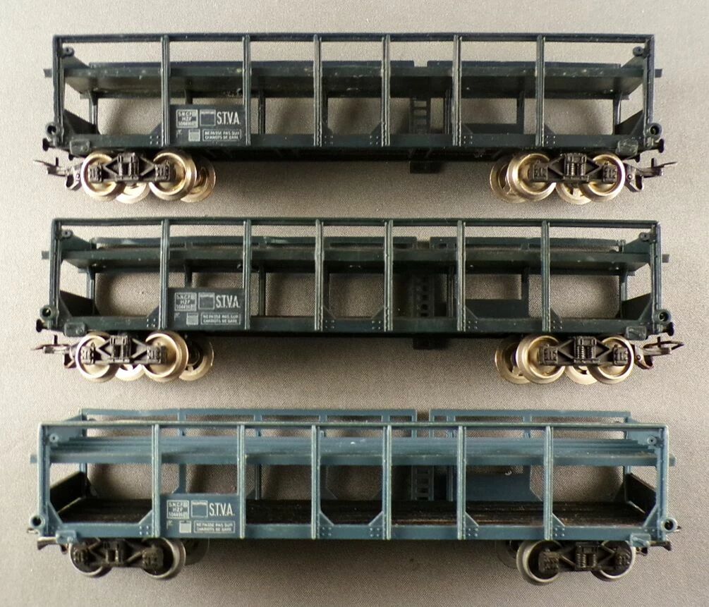 Jouef 6540 Ho Sncf 3 x Stva Car Transport Wagon, grey-blue and blue livery, type HZf, registration number 504496, without car. Length 170 mm. Good condition, complete, Diamond type black plastic bogie/coupling moulded screwed to the chassis, international couplings screwed to the bogies, metal wheels, side panels present and functional, no box, light oxidation of the coiplers on a wagon, without impact.