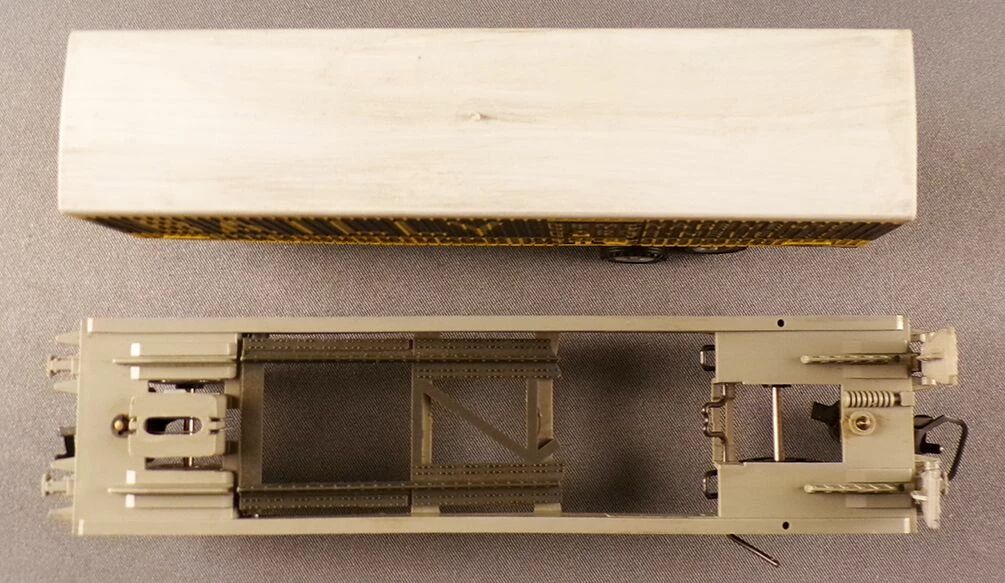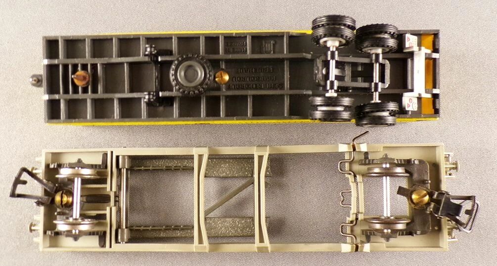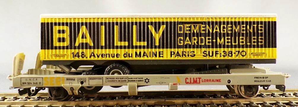 Jouef 6965 Ho Sncf C.I.M.T Lorraine Algeco kangaroo wagon with Bailly truck trailer, registration NM 524346. Length 160 mm. Very good condition, metal wheels, universal couplers, trailer roof and rear doors with light patina, on the wagon the marking is slightly faded on one side. a sole plate is glued in a high position and a small part of the chassis' movable piece is missing, without impact, no box.