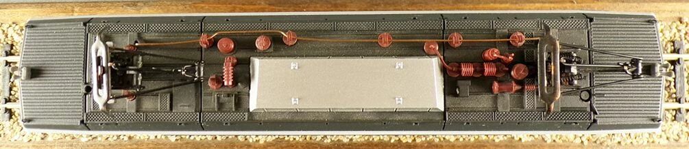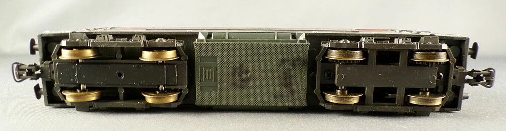 12-volt motor, type G (Lima), gear drive, 1 powered bogie clipped into the body/chassis assembly, 2 wheelsets with tires, burnished metal axles, molded coupling/bogie assembly in one piece.