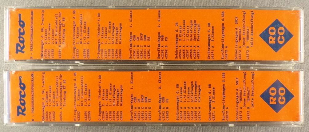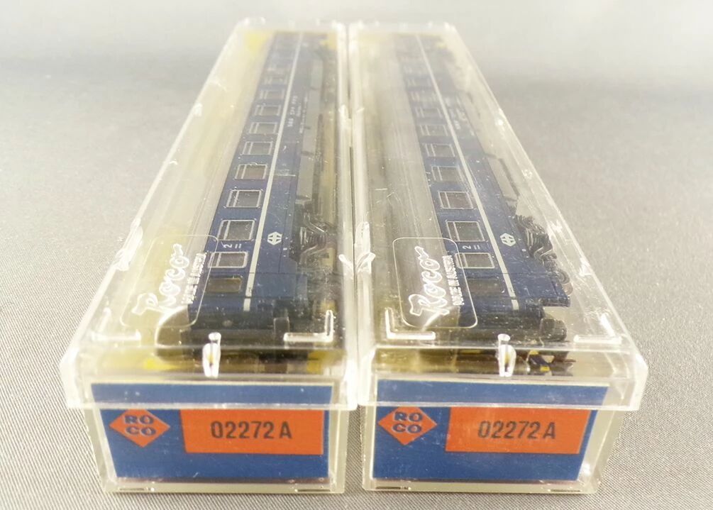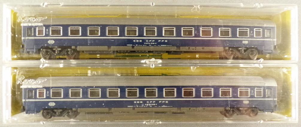 Roco 02272A (24244) N Scale Sbb Cff Ffs 2 x Sleeping coach Bcm type registration 61 85 50-70 100-6. With detailed interior fittings, blue livery grey stripe and roof. Length 154 mm. Mint in original box, burnished metal wheels, Roco couplers, complete, buffers ok, detail parts on sprue in bag, boxes in good condition.