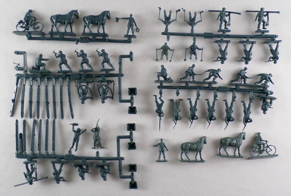 Condition : Vey good, most of the figurines are still on sprues, missing two crates and a machine gun stand, a laying machine gunner, and a crawling figure replaced by laying rifle figures