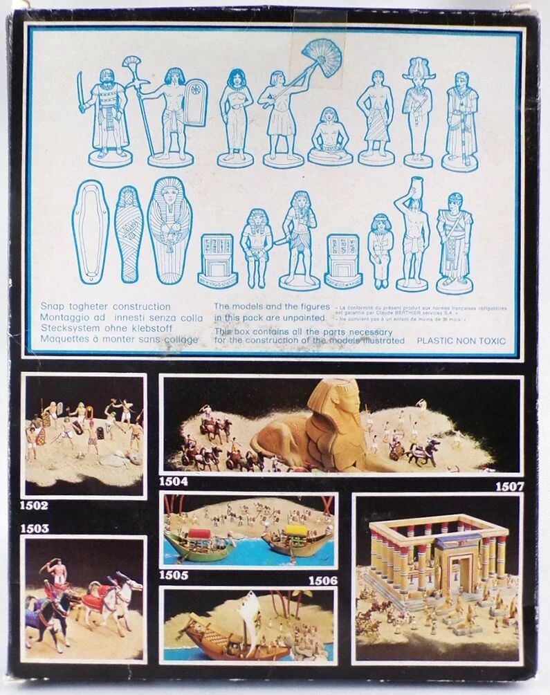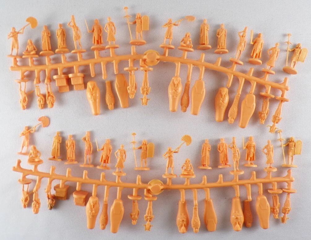 Condition : Very good condition with large folding box, historical multi-language leaflet, 68 pieces, 13 poses, sarcophagi with mummy and thrones, orange plastic, figures in very good condition, light traces of paint on a figurine, some are still attached to the sprue. The box still looks good, see pictures