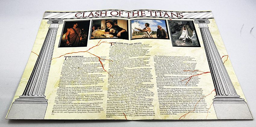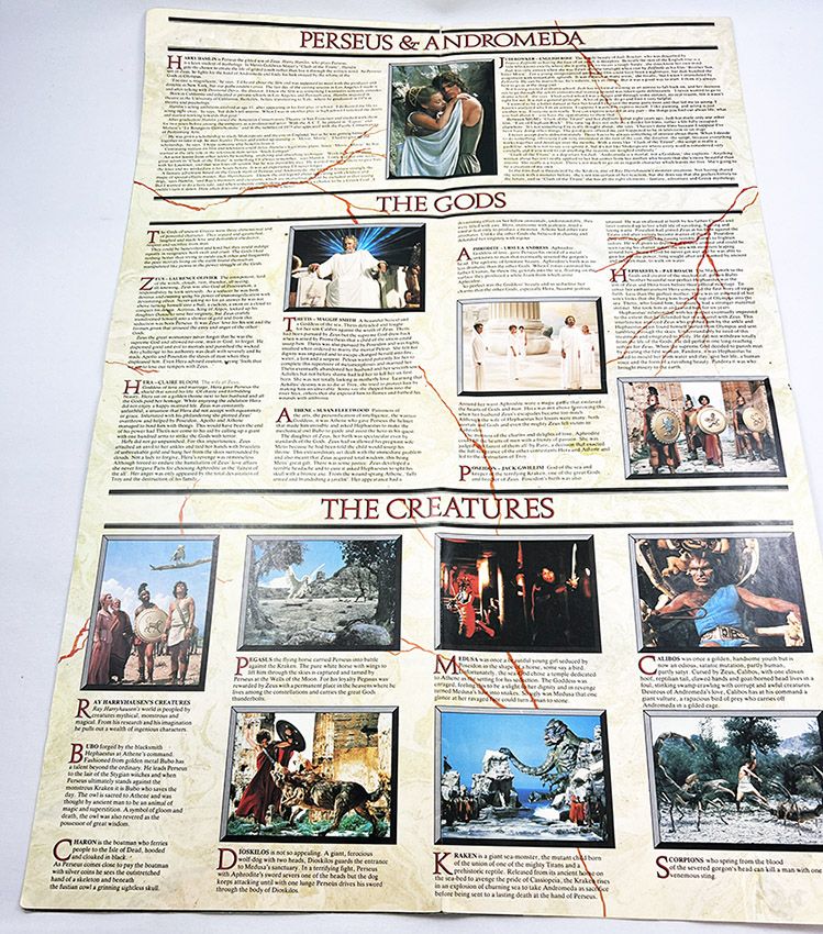 Type : Première édition, premier tirage. Pièce rare et de collection. Photographies couleur. Publication britannique en couleur avec une couverture, un dos de couverture, six pages de texte et de photos au recto, tandis que le verso présente une reproduction de l'affiche originale verticale du film "Le Choc des Titan" de 1981, illustrée par Richard Holliss, mesurant 58 x 84 cm une fois ouverte. Pliée, l'ouvrage mesure 21 x 29 cm.