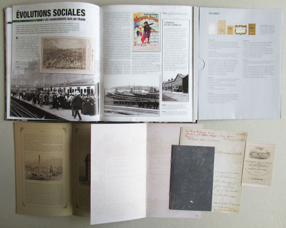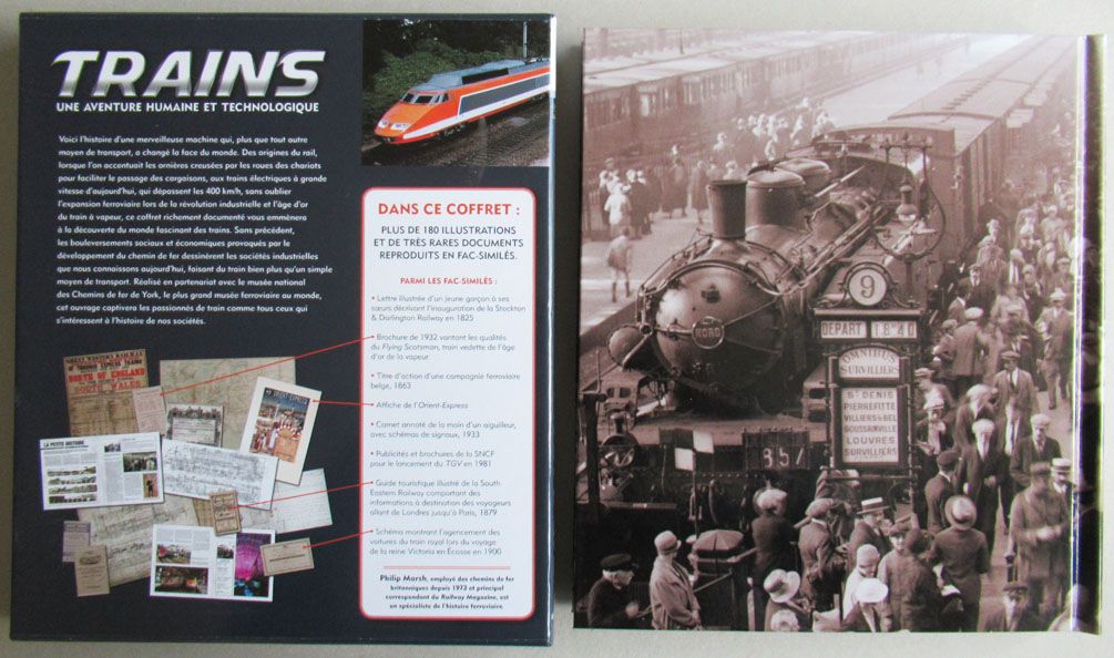 Livre Coffret Livre Trains Une Aventure Humaine et Technologique 20 Fac-similés de documents rare Format 31 x 26 x 3,5 cm, Boitage étui livre couverture cartonnée. Très bel état, comme neuf (petit impact sur la face de l'étui), pages propres, texte français.