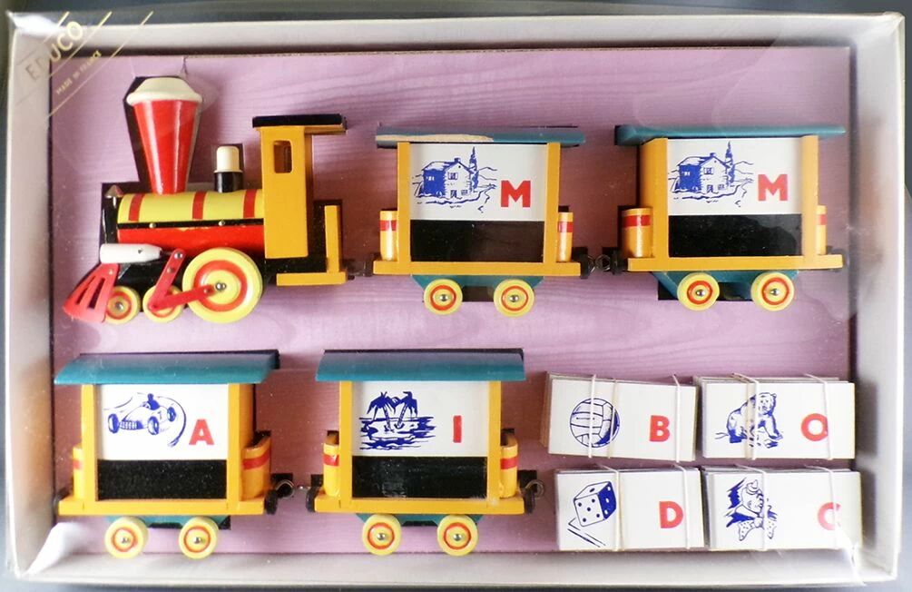 Condition : Very good, complete, a locomotive, four wagons, and 48 "wagon sides" allowing words to be created. Seems never to have been played with, however there is a chip of wood under the roof of one wagon, the inner rhodoid cover is cracked, and there is a small dent on the cardboard lid. - See pictures for more details.