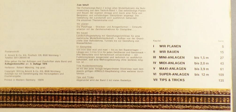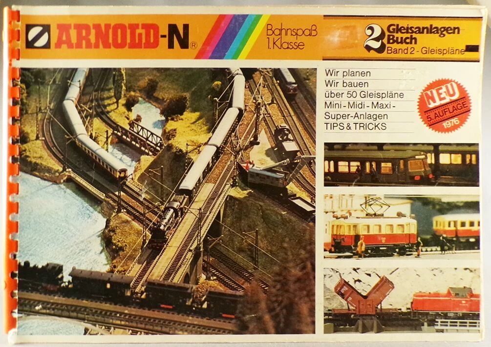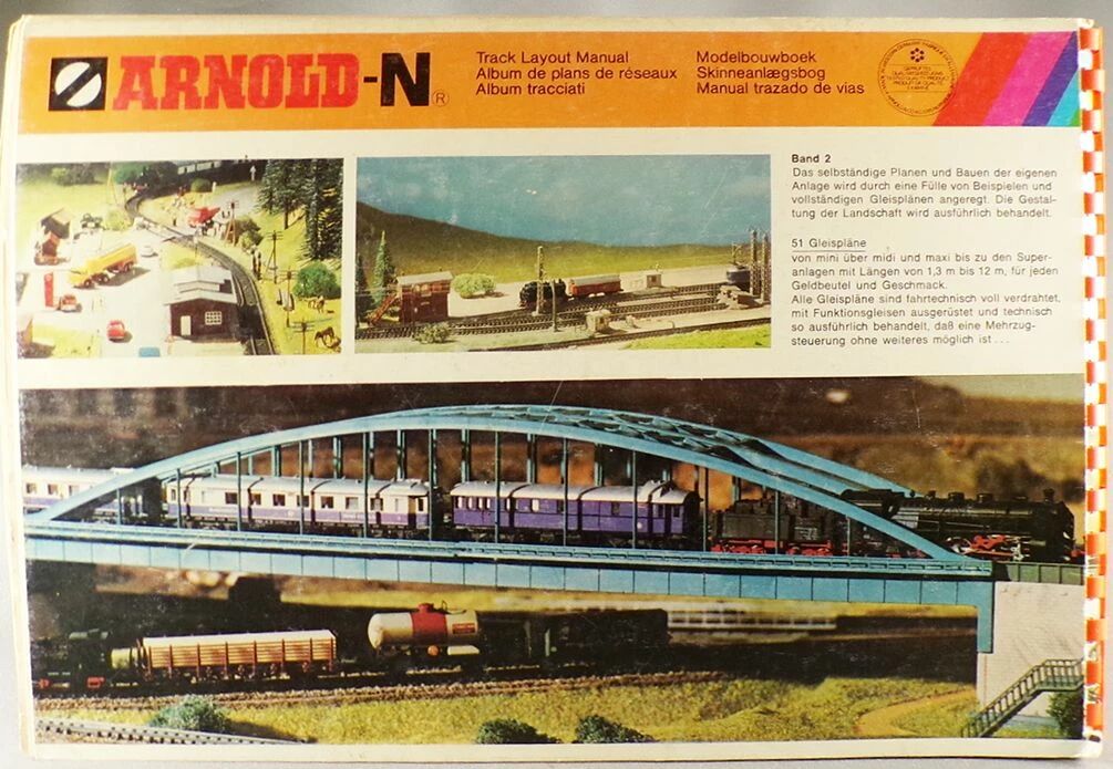 Arnold N Scale track layout technical manual 154 Pages & 50 network plans, in8 21 X 29,7 cm + small folded manual extra bonus. Very good condition, light marks on cover, clean and well white pages, german language.