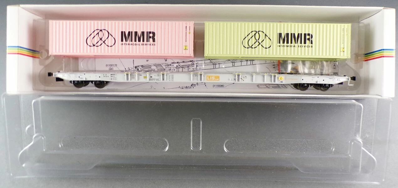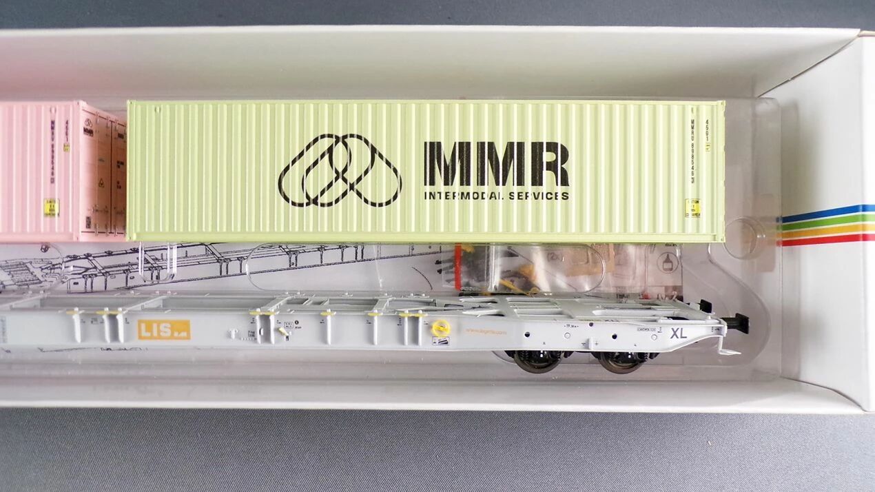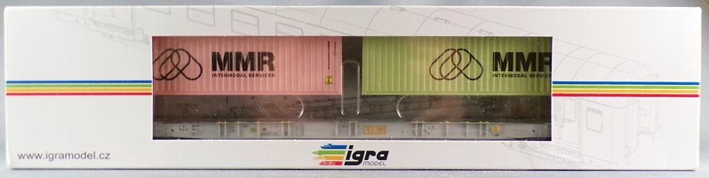 Igra 96010087 Ho Private company container flat wagon type Sggnss-XL LIS registration 37 84 4694 001-7 with 2 x 40-foot containers from the company MMR. Length 303mm. NEM 362 coupling socket with short coupling mechanism. Era VI. Super detailed model, DC. New in box, detailing parts in bag, photo-etched metal parts.