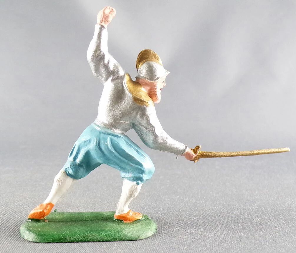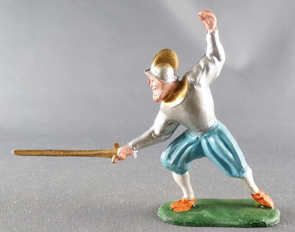 Accueil > Petits Soldats > Cyrnos - Renaissance - Piéton Casque Barbichette Attaquant Epée Pantalon Bleu