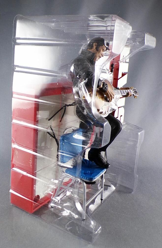Stunningly detailed in blach leather,this super stage figure includes custom stage diorama base with chair, guitar, mic with stand and lettering backdrop.