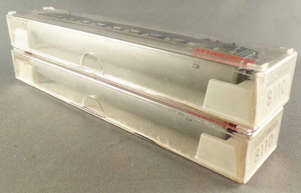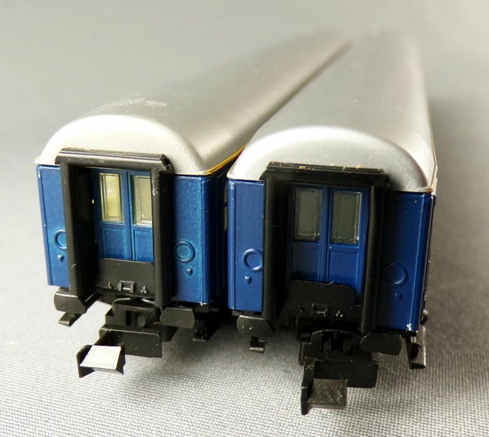 Blue livery silver roof. With detailled interior fitting, burnished metal wheels, interior lighting 9458 that can be installed. Length 165 mm. Mint in box, unused, complete, buffers, stairs and couplers ok, boxes in good condition.