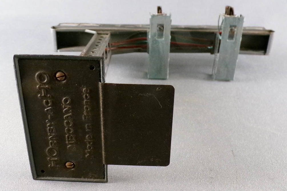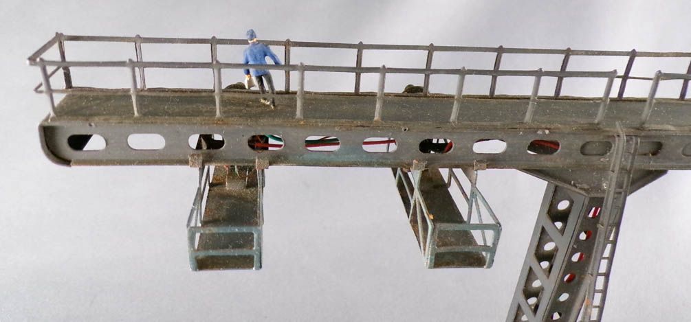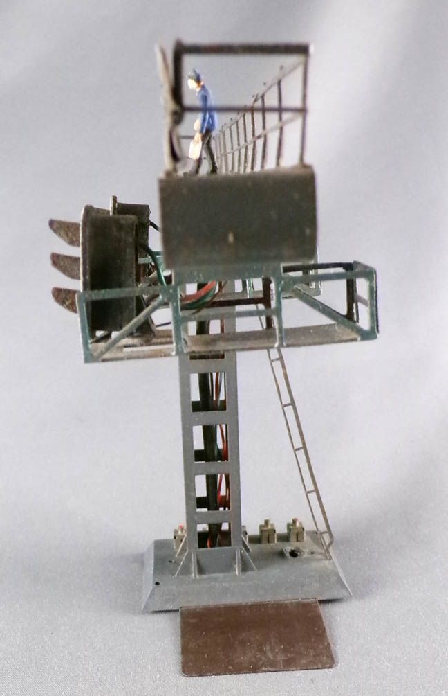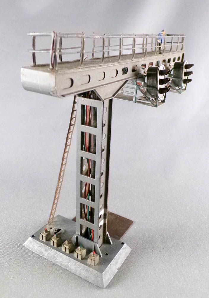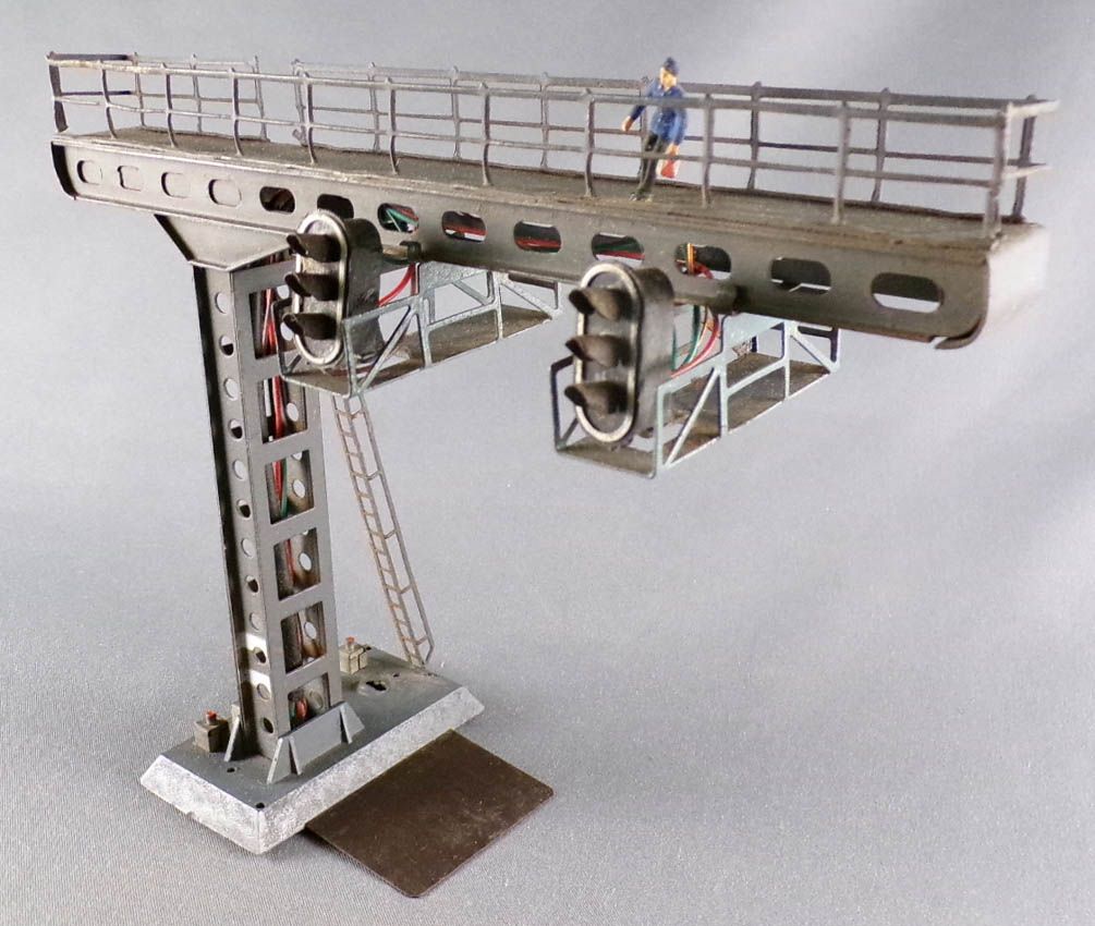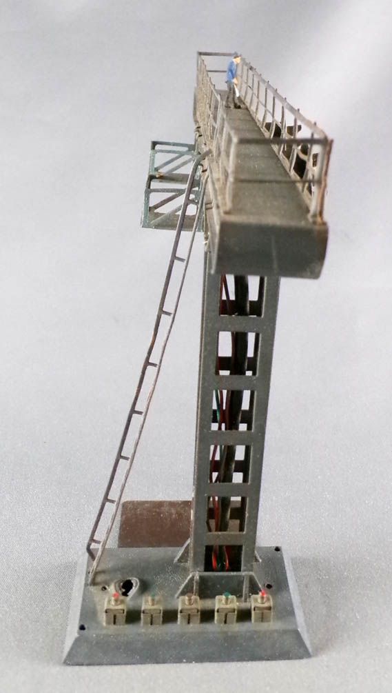 Hornby AcHo 6650 Ho Gantry with 2 Signals 2 Lights (green & red), railway worker figure on the walkway. Good condition without box, not tested