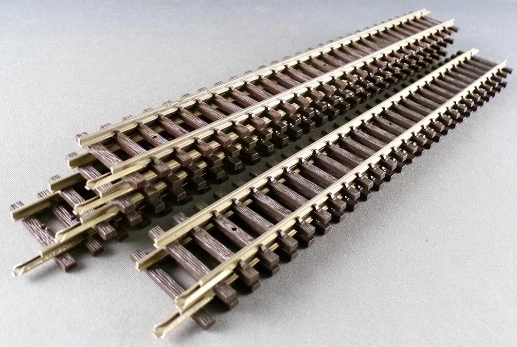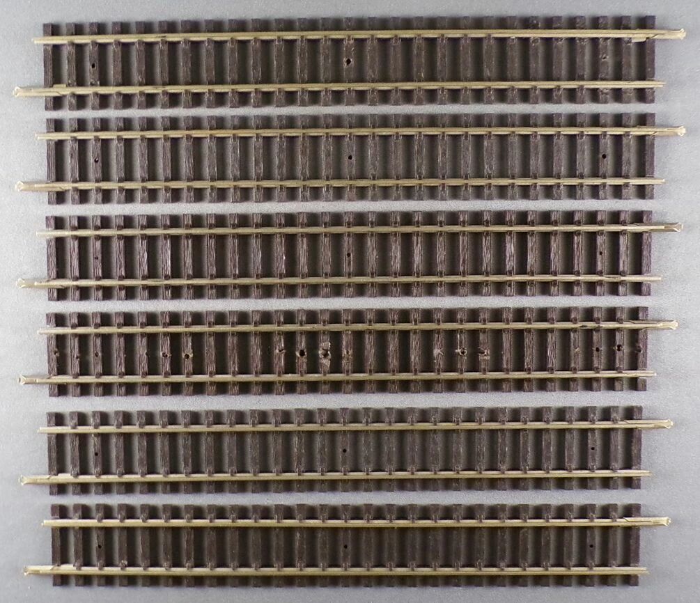 Hornby AcHo 7500 6 Rails Droit Maillechort 219 mm. Très bon état, complet avec éclisses, pas de casse, trous de vis élargis sur les traverses d'un rail, sans boite