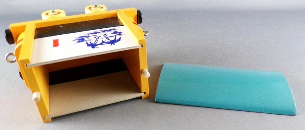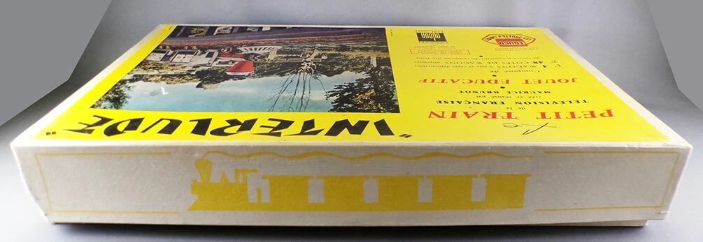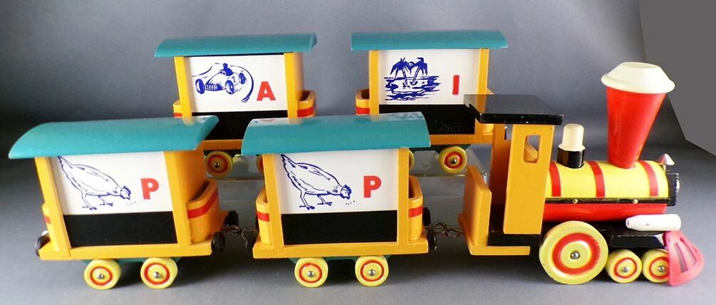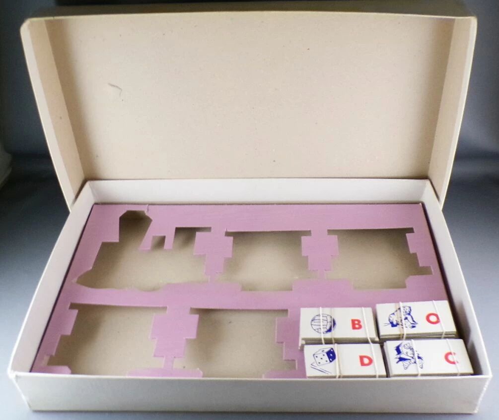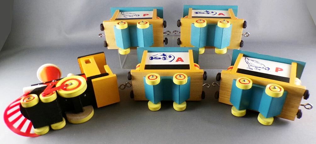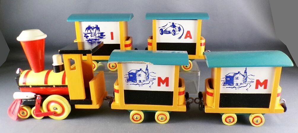 Condition : Très bon état, complet, une locomotive, quatre wagons et '48 "cotés de wagons" permettant de créer des mots. Semble n'avoir jamais joué, cependant il y un éclat de bois sous le toit d'un wagon, le couvercle intérieur en rhodoïd est craqué, et il y a un petit enfoncement sur le couvercle carton. Voir photos pour plus de détails.