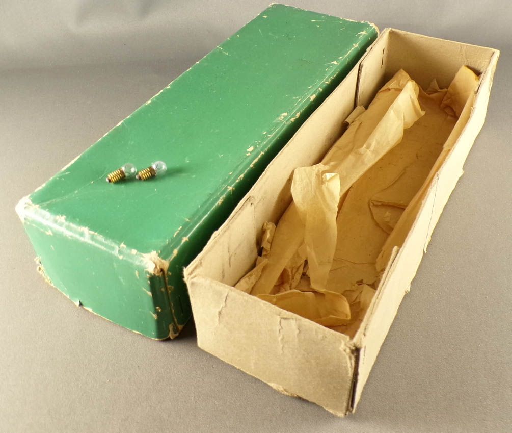 Très bon état en boite, complète, tampons et pantos métalliques ok, testée, fonctionne bien, bonne adhérence. La boite est encore propre avec papier de protection d'origine, il y a deux ampoules dans la boite qui ne correspondent pas à ce modèle, comme elles y sont depuis des lustres nous les avons laissé