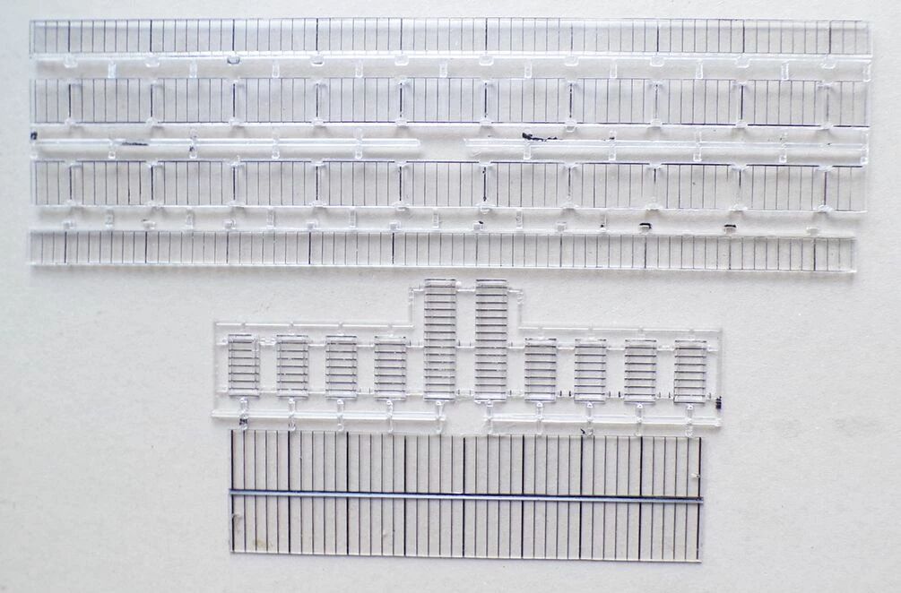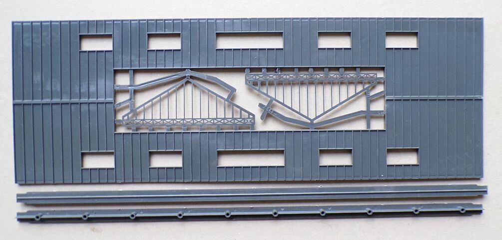 Jouef 1019 Ho Glass roof for passenger station. Mint without box, there is just the top of the lid, parts on sprue. Assembly instructions printed on the back of the lid. With platforms, both are painted gray with a white border and all their accessories, platform end with cutout for the buffers, standing clocks, numbering sign, benches, protective walls for stair descents, flower boxes, plate to cover the stairs if not used.