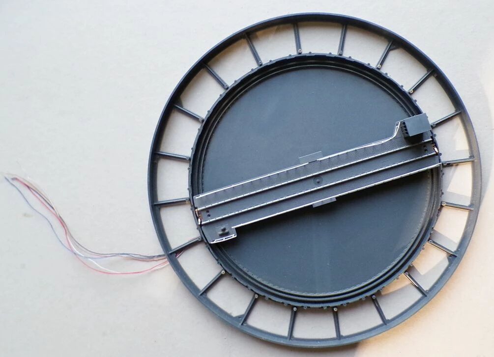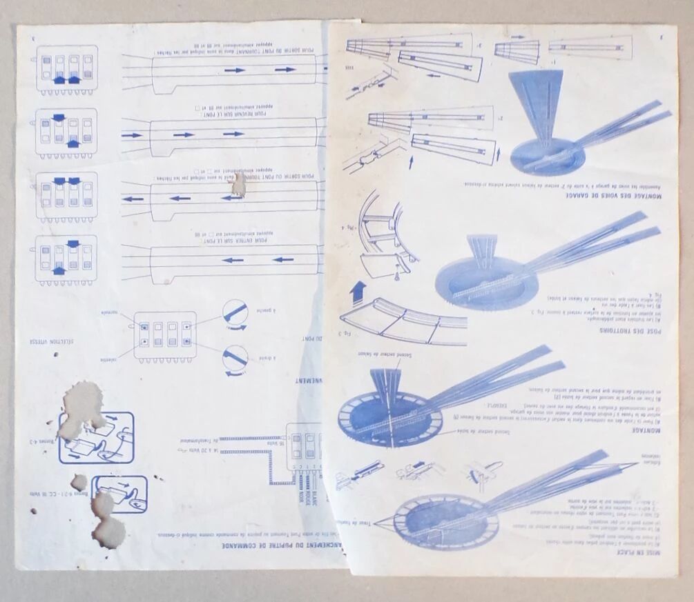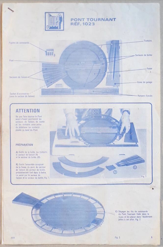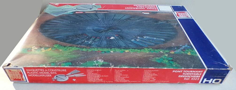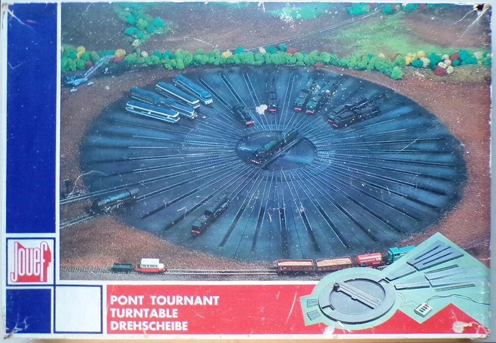 Jouef 1023 Ho Electric Turntable including 2 sidewalks, 1 grave, 1 motorised turntable, 2 Sidings with pit, 2 connexion sections, 2 sections of abutment, 2 access- ramps, 1 remote control, 2 bags with accessorie, 1 center of turntable with connexion wires, 2 instructions sheets. Steel Track. Good condition with original faded box, the plastic terminals of the control box and the mounting screws for the connecting components are in the clear bag, some marks, delivered with an extra motor carbon brush. Box 69 x 47,5 x 6,7 cm, turntable diametre 40,5 cm