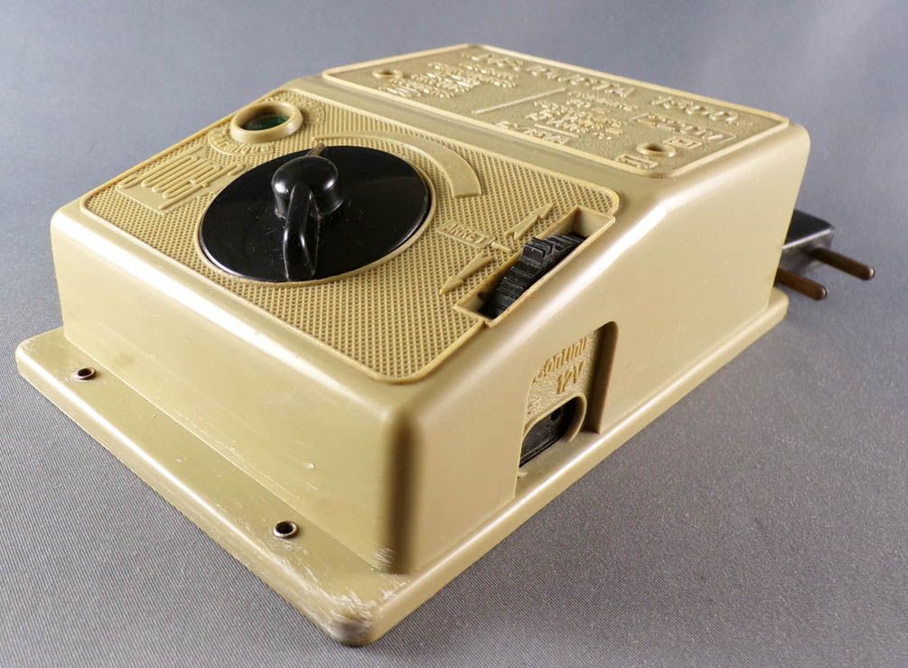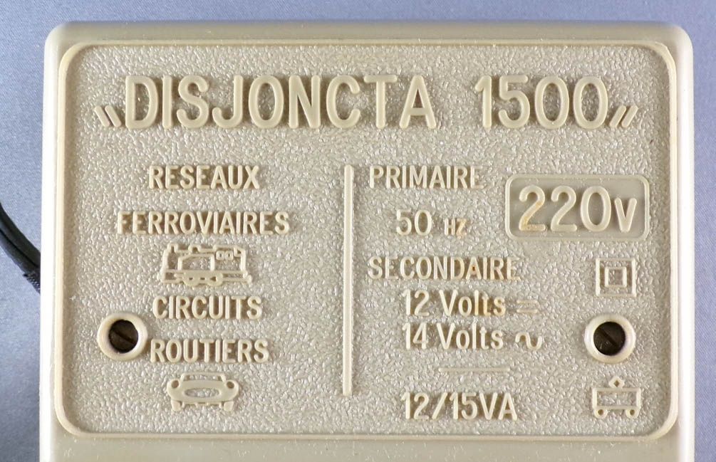 Jouef 1500 Ho Transformateur redresseur disjoncta 220V CC 12V 1A + CA 14V 1A avec variateur de vitesse et inverseur de sens de marche. Primaire 220V 50Hz secondaire 12V 1A en courant continu et 14V 1A en courant alternatif pour les accessoires . En  boite, corps plastique gris partiellement jauni, testé, fonctionne, complet avec cordon secteur raccourci, câble alimentation rails et prise accessoires.