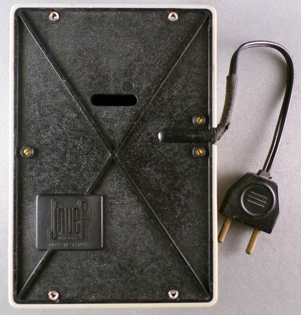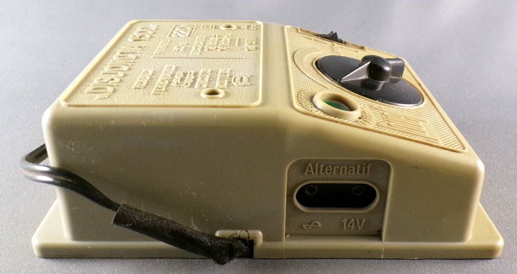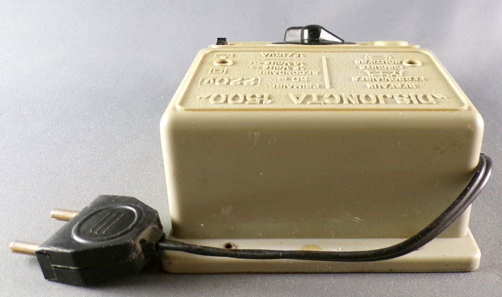 Jouef 1500 Ho Transformateur redresseur disjoncta 220V CC 12V 1A + CA 14V 1A avec variateur de vitesse et inverseur de sens de marche. Primaire 220V 50Hz secondaire 12V 1A en courant continu et 14V 1A en courant alternatif pour les accessoires . En  boite, corps plastique gris partiellement jauni, testé, fonctionne, complet avec cordon secteur raccourci, câble alimentation rails sans la fiche pour les rail (fils à nus, à souder) et prise accessoires.