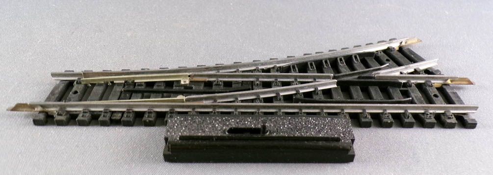 Jouef 4085 Ho 1 Aiguillage manuel à gauche rails acier, 22°30 R 385 longueur 153 mm. Très bon état, complet avec éclisses, sans boite.