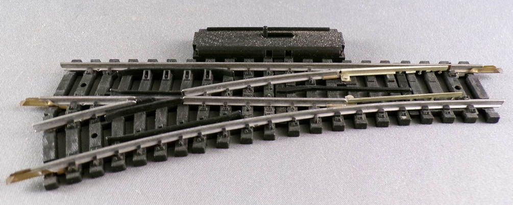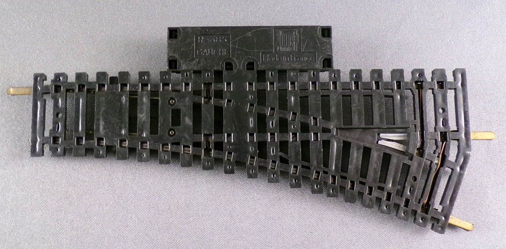 Jouef 4085 Ho 1 Hand control points turn left 22°30 R 385 steel tracks, length 153 mm. Very good condition, complete with fishplate on both ends, no box.
