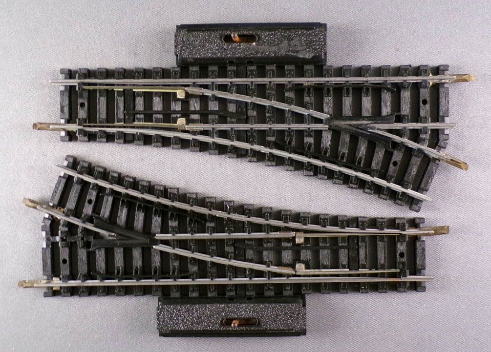Jouef 4184 2 Aiguillages électriques à droite Rails Acier 22°30 R 385 mm longueur 153 mm. Très bon état, fils coupés, à cabler, complet avec éclisses, sans boite.
