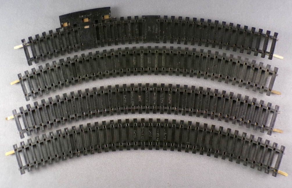 Jouef 470 Ho 4 Rails courbes acier R 325 R=12 3/4 dont 1 d'alimentation. Très bon état, complets avec éclisses