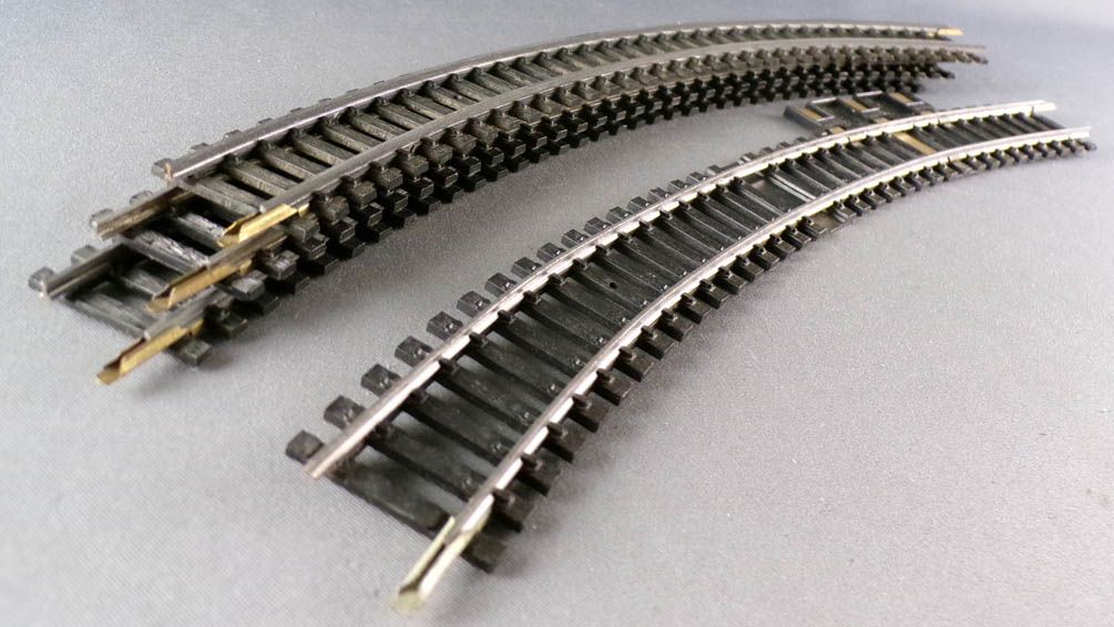 Jouef 470 Ho 4 Steel curved rails R 325 R=12 3/4 includes 1 for power supply. Very good condition, complete with fishplate on both ends