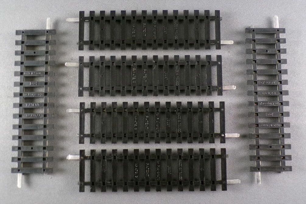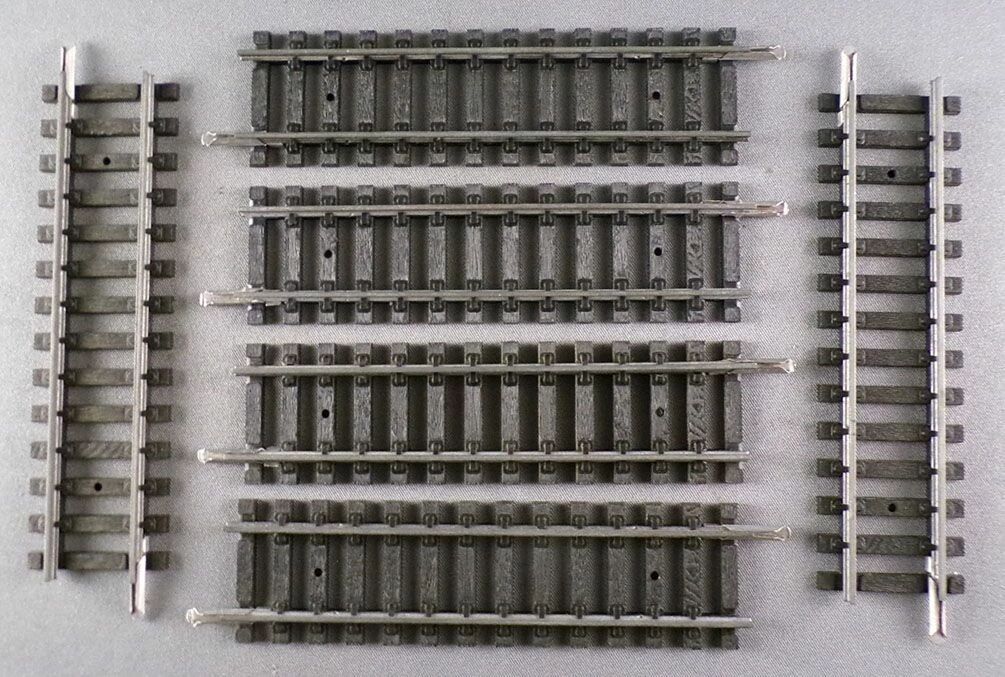 Jouef 475/3 Ho 6 x Half straight tracks 102 mm 14 Sleepers, steel tracks, Very good condition, complete with fishplates on both ends.