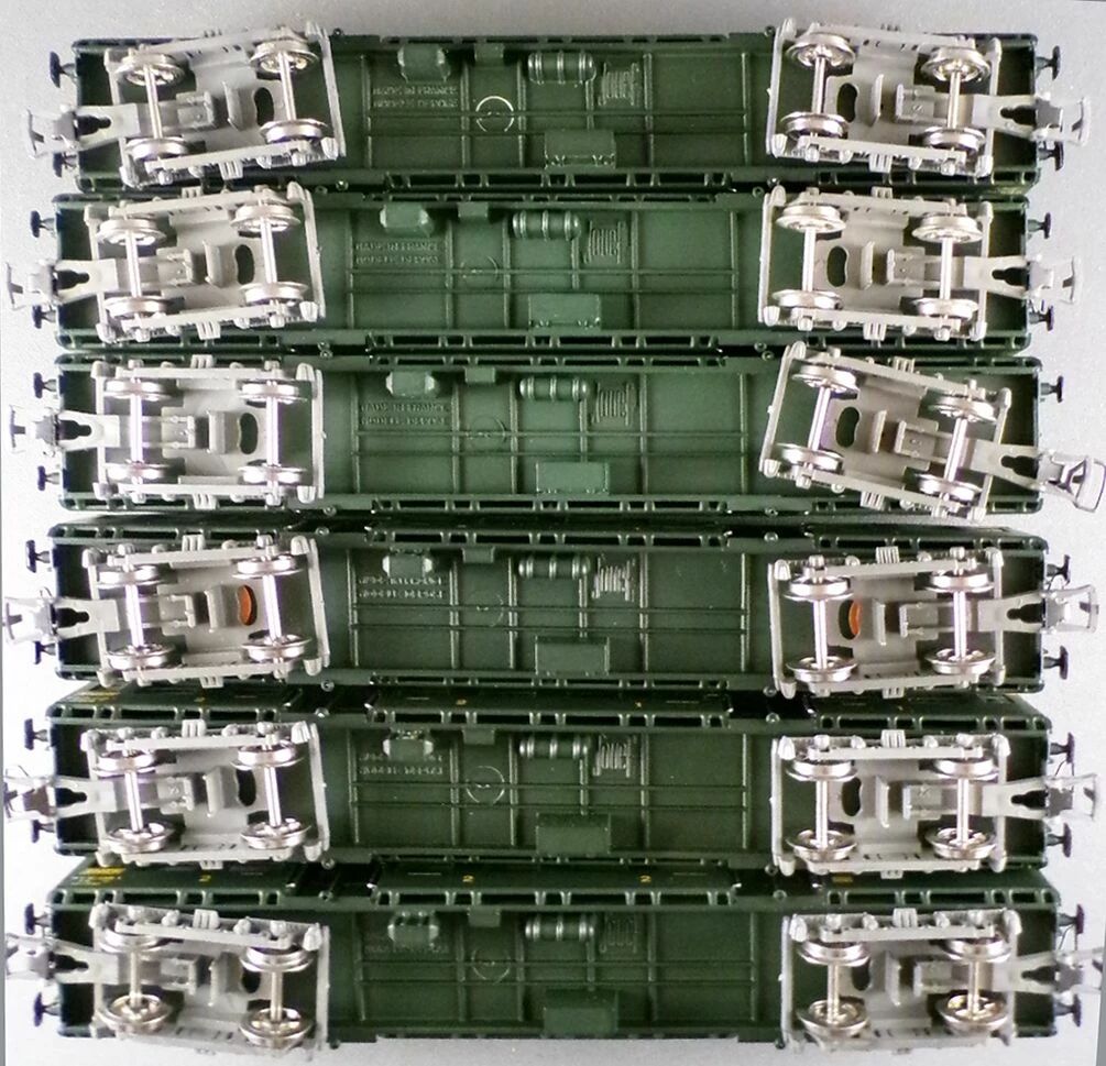Livrée vert toit vert. Sans aménagement intérieur, roues métal, ensemble bogie/attelage plastique gris moulé d'une seule pièce, bogies type WL clipsés, attelages internationaux moulés avec le bogie. Longueur 216 mm. Neuves en boites d'origines, n'ont jamais roulé, complète, tampons ok, boites en bel état, les tricolore sont complètes avec tout les rabats, écriture sur le couvercle rouge de la réf 5104.
