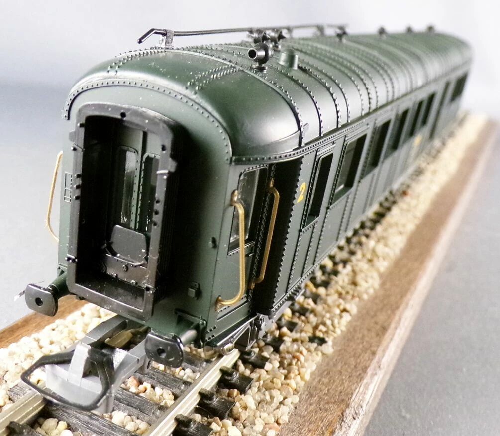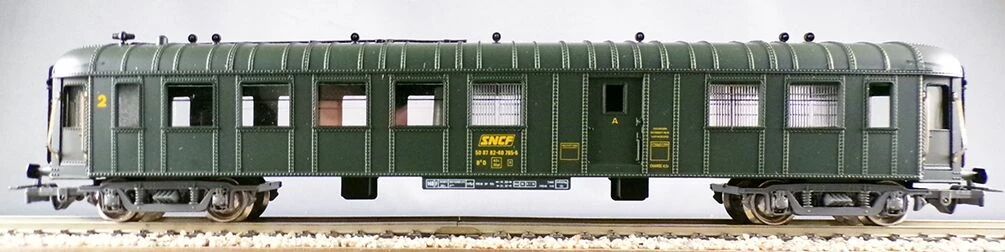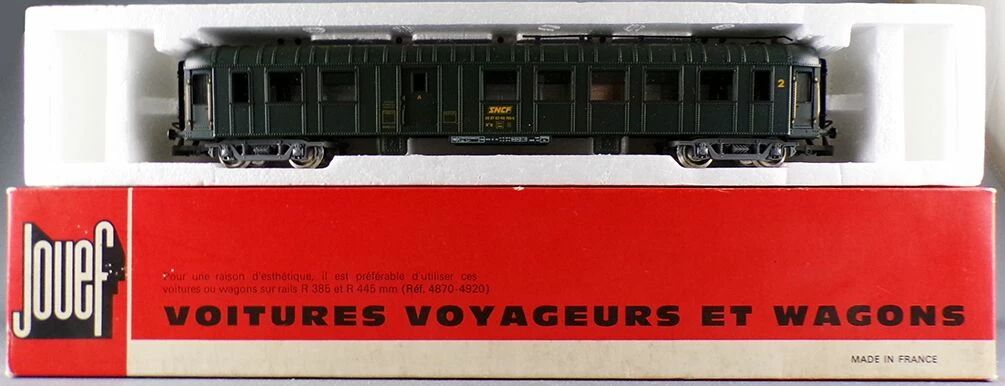 Jouef 5113 Ho Sncf Voiture Ocem à rivets apparents 2ème Classe fourgon Type B4D immat 508782-40765-6. Livrée vert toit vert sans aménagement intérieur, roues métal, attelages à boucle. Longueur 250 mm, époque III & IV. Neuve en boite rouge, n'a jamais roulé.