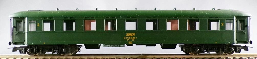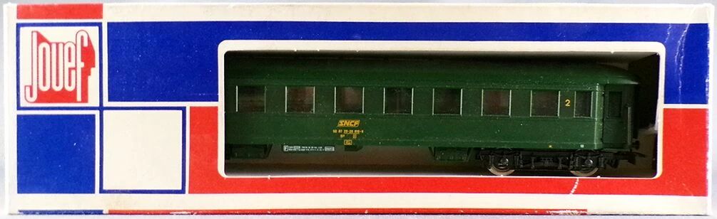 Jouef 5121 Ho Sncf coach N35 Drg 2nd class B⁹ 50 87 29 20 016-4-7 framed logo. Green livery metal wheels, universal couplers, length 240mm. Mint in tricolour box, unused