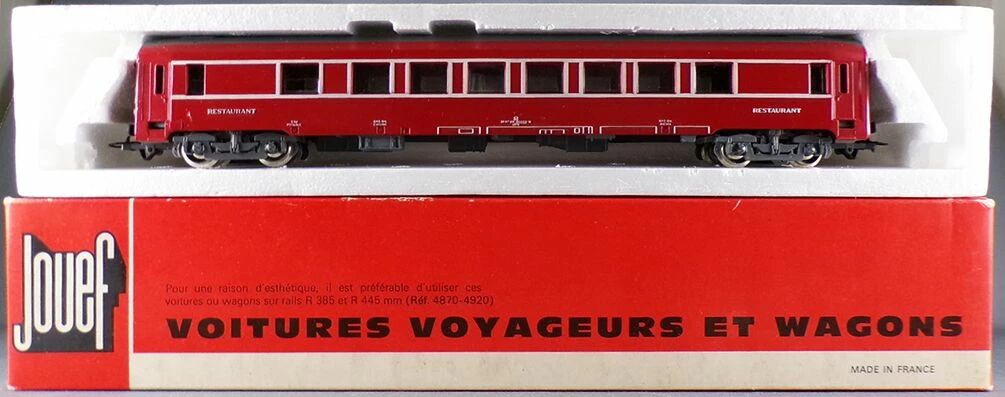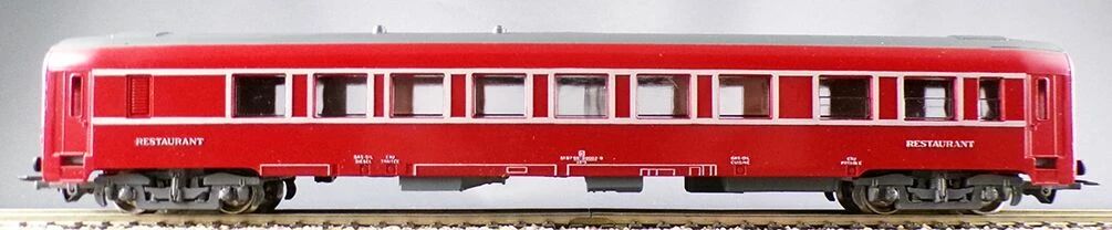 Jouef 5490 Ho Sncf Restaurant type Dev coach red livery registration number 518788-80002-8. Length 277 mm, metal wheels, universal couplers. Mint in red box, complete, buffers ok.