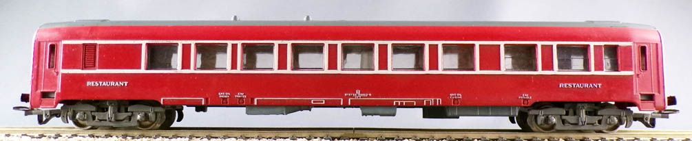 Jouef 5490 Ho Sncf Voiture type Dev Restaurant Livrée Rouge Immat 518788-80002-8. Longueur 277 mm, roues métal, attelages à boucle. Bel état, complète, tampons ok, en boite vitrine avec socle rouge avec de légères traces.