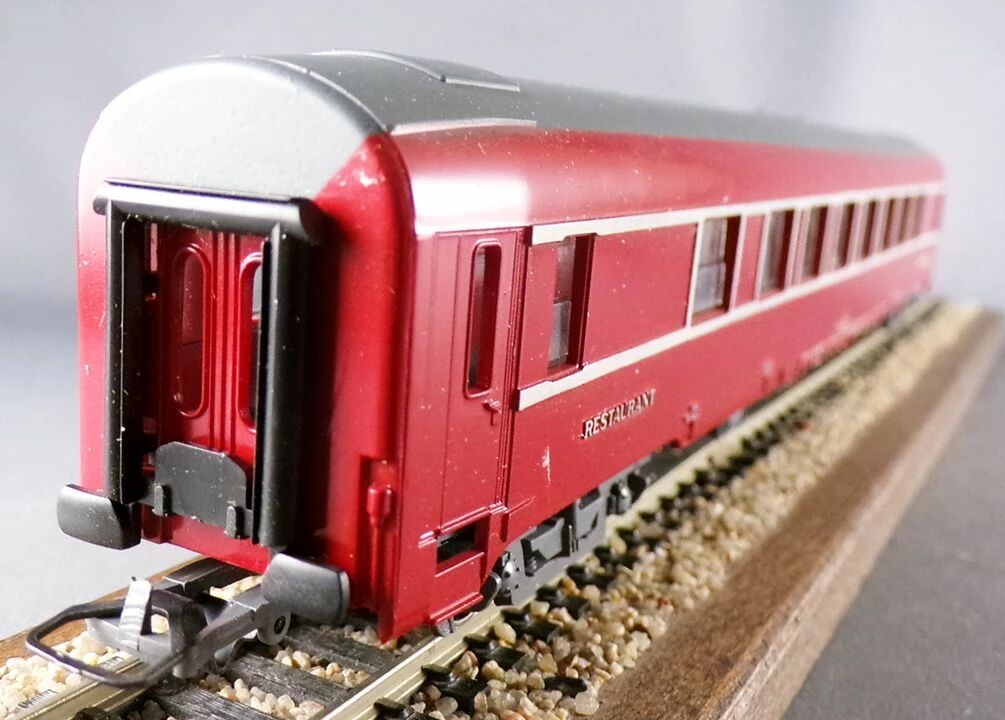 Jouef 5490 Ho Sncf Voiture type Dev restaurant livrée rouge Immat 518788-80002-8. Longueur 277 mm, roues métal, attelages à boucle. Neuve en boite rouge, complète, tampons ok.