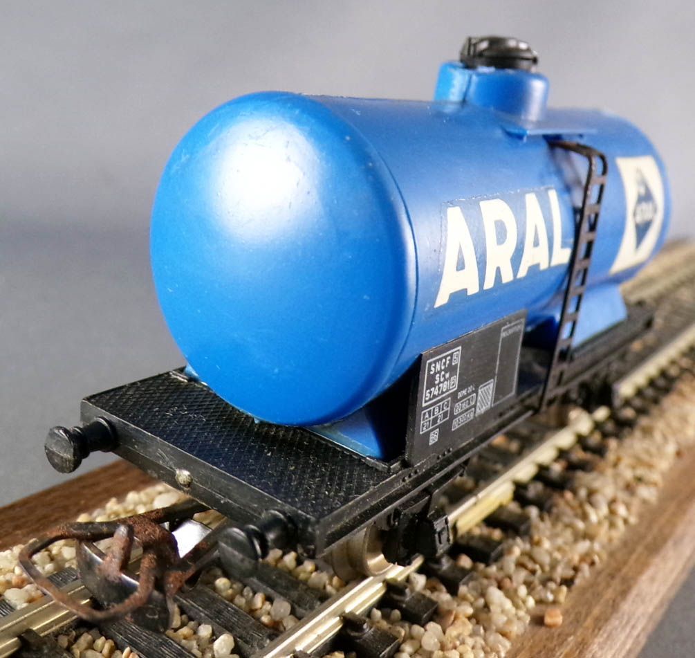 Jouef 6301 Ho Sncf Aral Tank Wagon 2 Axles blue livery, type SCw n° 574781. Length 102 mm, universal couplers, metal wheels. Good condition, complete, buffers ok, slight oxidation on the couplers, no box .