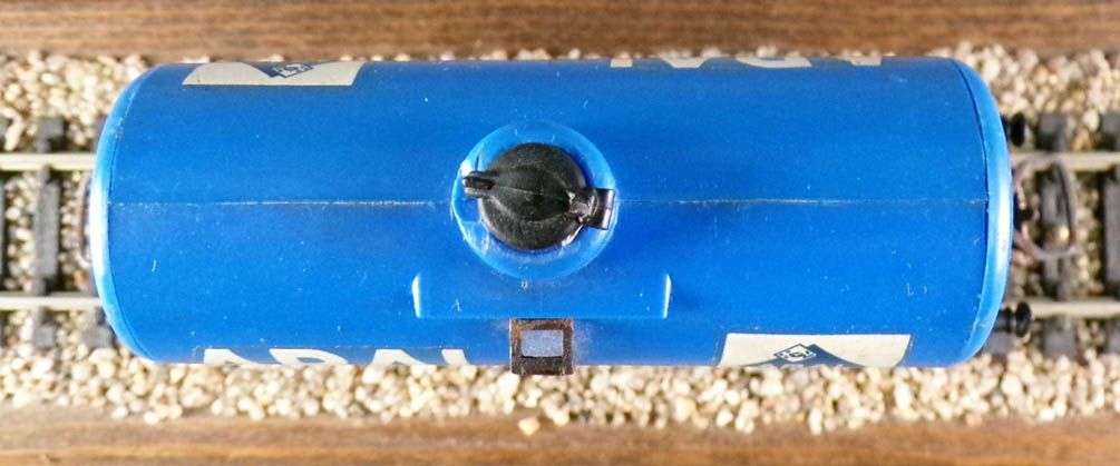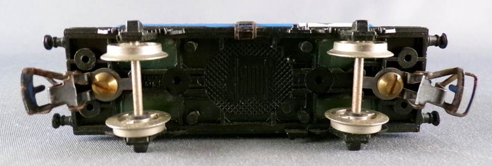 Jouef 6302 Ho Sncf Wagon Citerne BP de gros diamètre à échelle transversale, 2 essieux, livrée bleu, type SCw immat 574781. Longueur 102 mm, attelages internationaux vissés au châssis, roues métalliques. Bon état, complet, tamons ok, légère oxydation sur les boucles d'attelage, sans boite rouge.