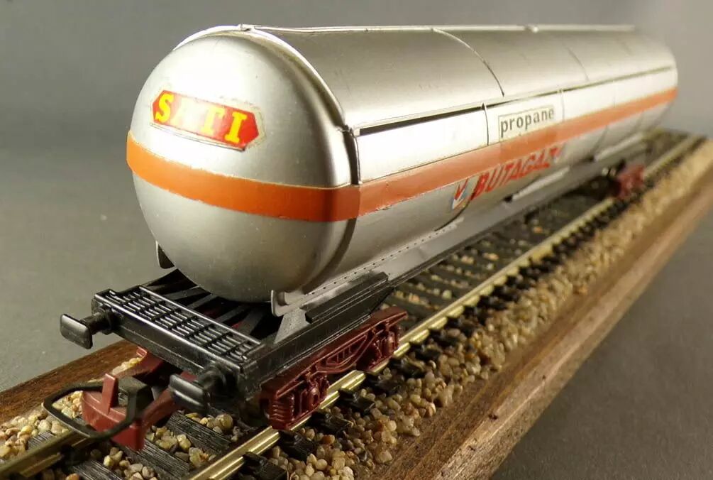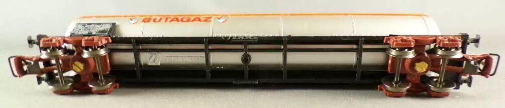 Jouef 6511 Ho Sncf Tank Wagon type Uahs N° 21 87 007 5 585-6 with bogies Cie Butagaz silver livery. Length 216 mm, metal wheels, universal couplers. Very good condition complete, small part of the orange stripe deglued, without box