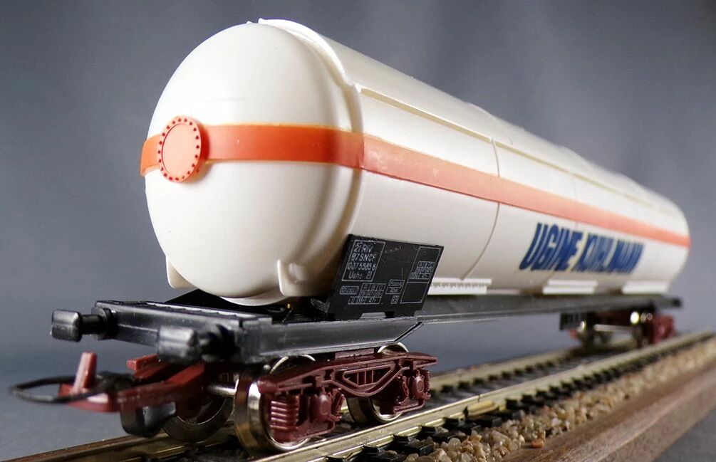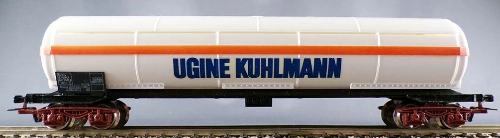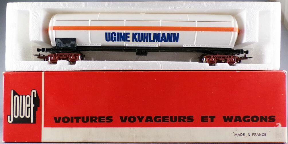 Jouef 6513 Ho Sncf Tank wagon type Uahs with bogies Cie Ugine Kuhlmann white livery. Length 216 mm. Mint in red box in very good condition, complete, buffers ok, unused.