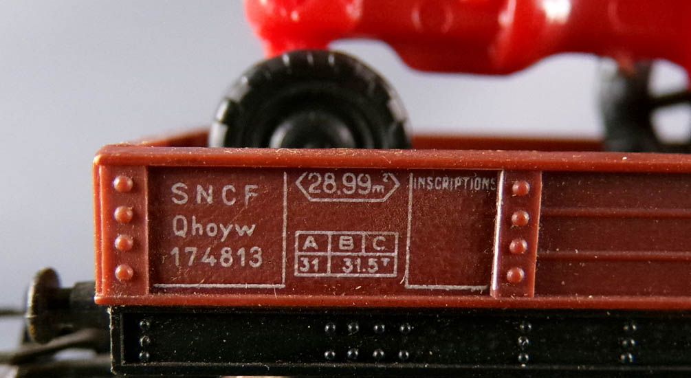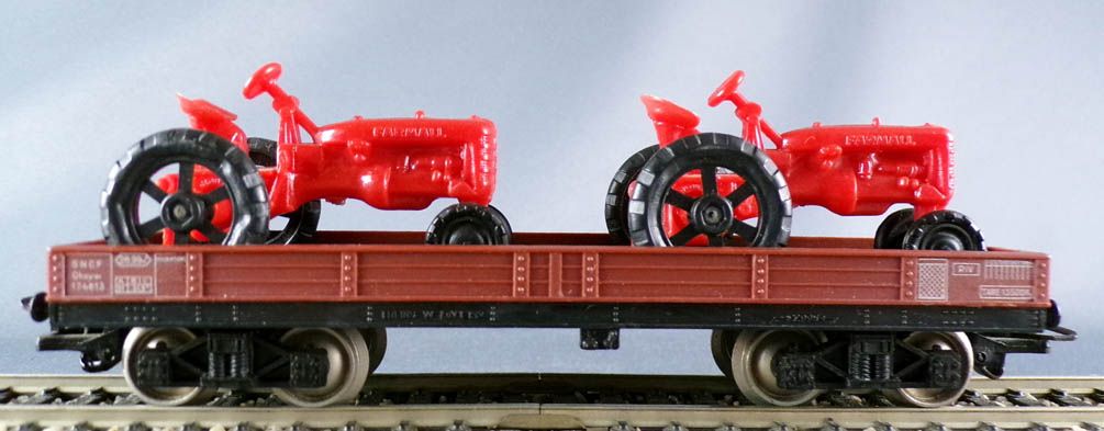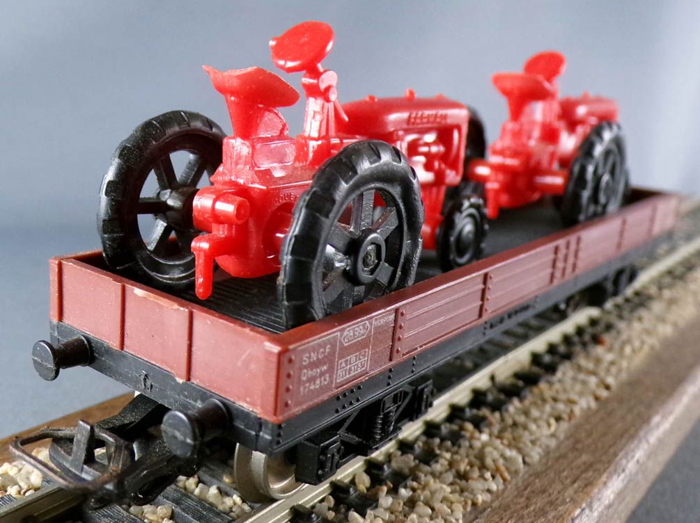Jouef 6520 B Ho Sncf wagon plat à bogies type Qhoyw immat 174813 livrée brun avec 2 tracteurs agricoles Farmall rouges. Longueur 140 mm, roues métal, attelages à boucle. Très bon état, sans boite, complet, tampons ok.