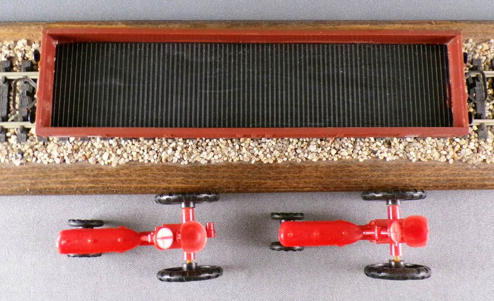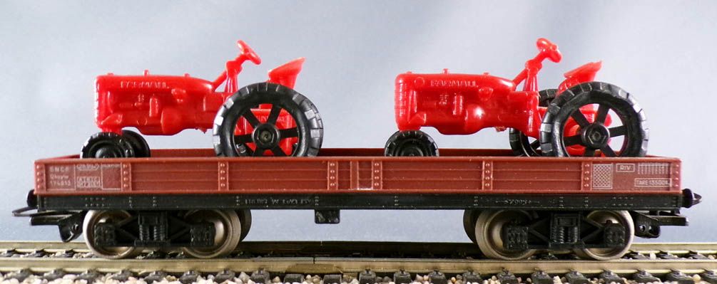 Jouef 6520 B Ho Sncf flat wagon with bogies, Qhoyw type, registration number 174813, brown livery with 2 red Farmall agricultural tractors. Length 140 mm, metal wheels, universal couplers. Very good condition, no box, complete, buffers ok.