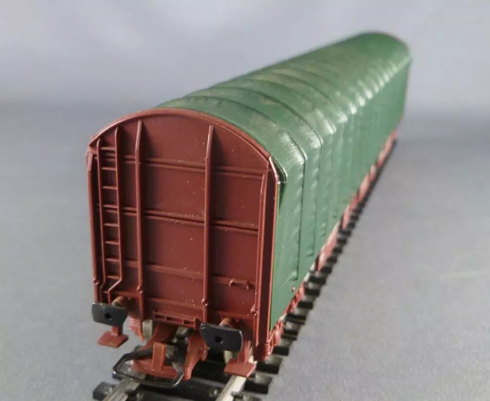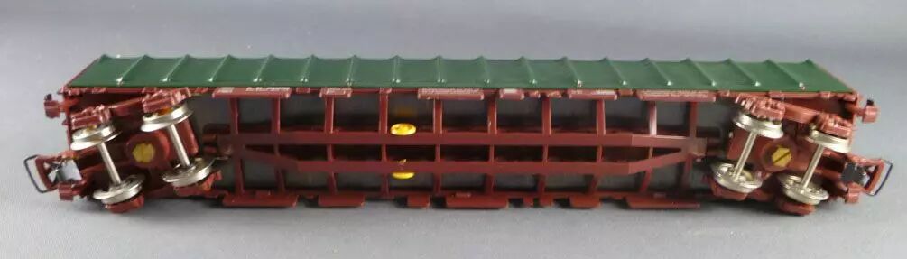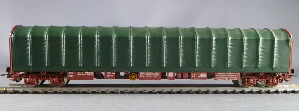 Jouef 6752 Ho Sncf Flat wagon with canvas cover, 8b axles (bogies), brown livery with green canvas, registration 31 87 35400083. Length 225 mm. Perfect condition, buffers ok, metal wheels, universal couplers, no box.