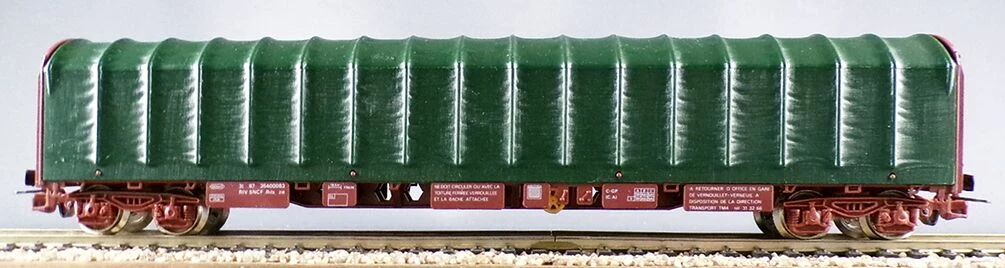 Jouef 6752 Ho Sncf Wagon plat à dossiers bâché Type Rils 216 livrée bauxite bâche verte immat 31 87 35400083. Longueur 225 mm, châssis plastique brun, essieux et roues métalliques, bogies vissés, type Y 25, ensemble bogie/attelage international brun moulé d'une seule pièce, attelage international. Neuf en boite tricolore, jamais roulé, complet, tampons, marchepieds et volants ok, .