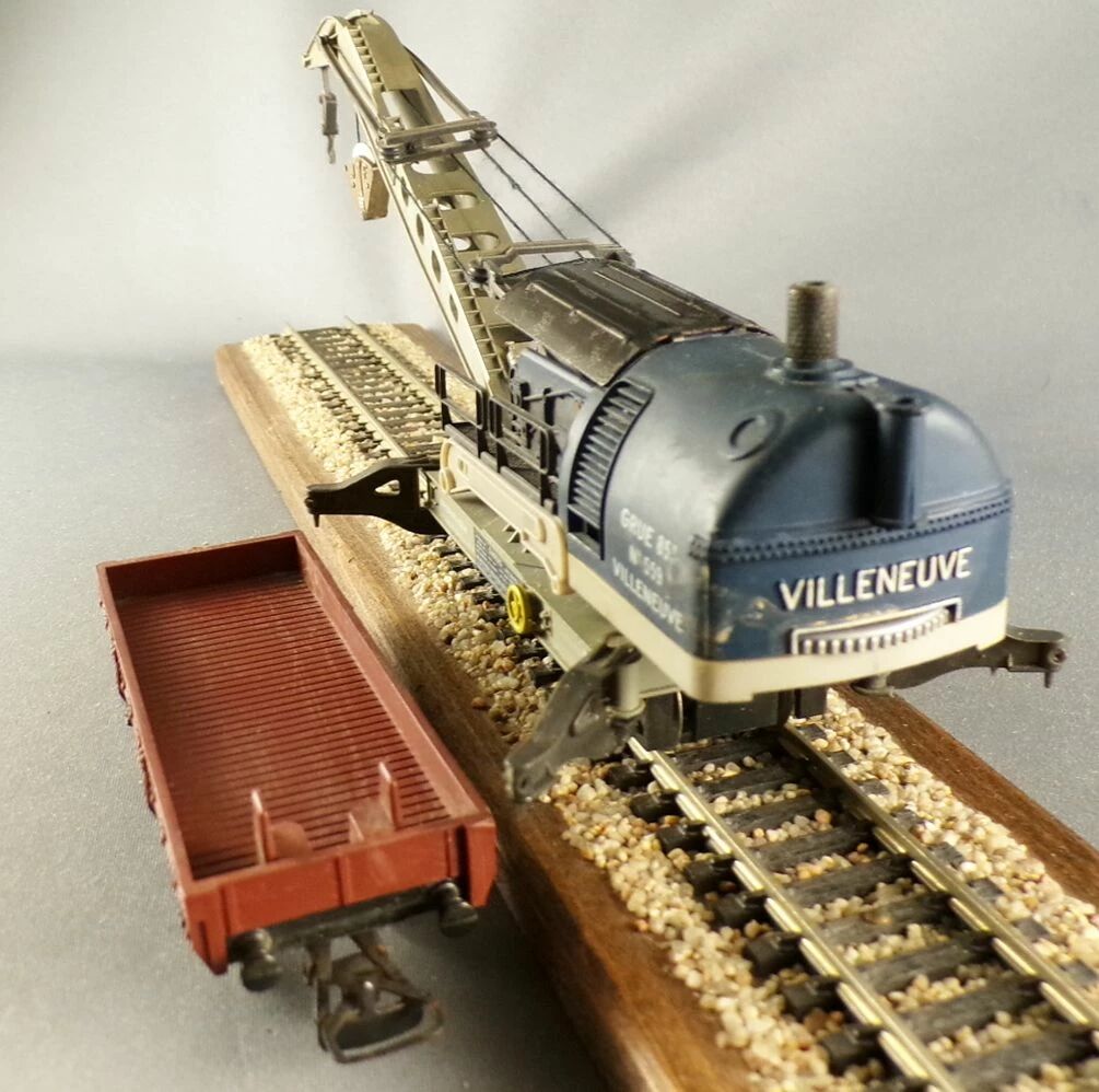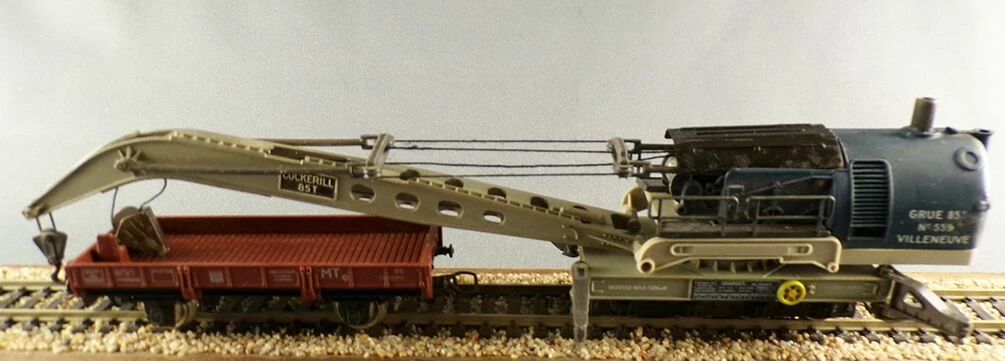 Jouef 6963 Ho Sncf Grue Cockrill 85 TonnesN° 599 Dépot de Villeneuve, cabine pivotante avec flèche réglable & crochet mobile et fonctionnel, rambardes noires + wagon plat porte flèche Jho 162503 MT . Roues métal. Bel bel état, un crochet cassé, petite corrosion sur le capot de la grue, sans boite .